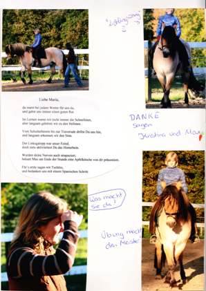 - Du schaffst es immer durch deine lustige, gutgelaunte und absolut kompetente Art und Weise, sowohl mich, als auch mein Pony zu motivieren und uns zu unseren persönlichen Höchstleistungen anzutreiben.